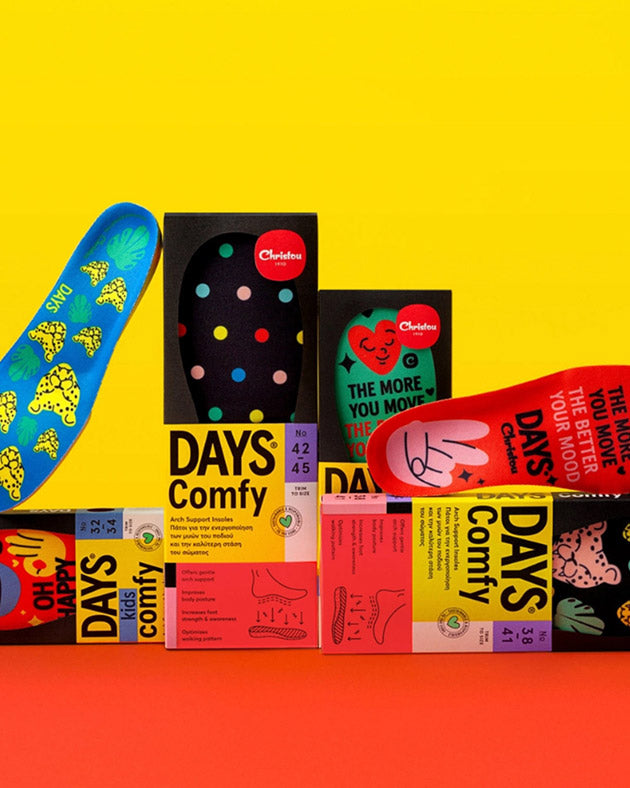 Τα πόδια σου κάνουν τα πάντα. Τρέχουν, παίζουν, στέκονται, περπατούν — από τα πρώτα βήματα ενός παιδιού μέχρι την πιο απαιτητική μέρα ενός ενήλικα. Οι DAYS Comfy σχεδιάστηκαν για να τα στηρίζουν σε κάθε βήμα, με τεχνολογία 3 layers που αγκαλιάζει, απορροφά και προστατεύει.